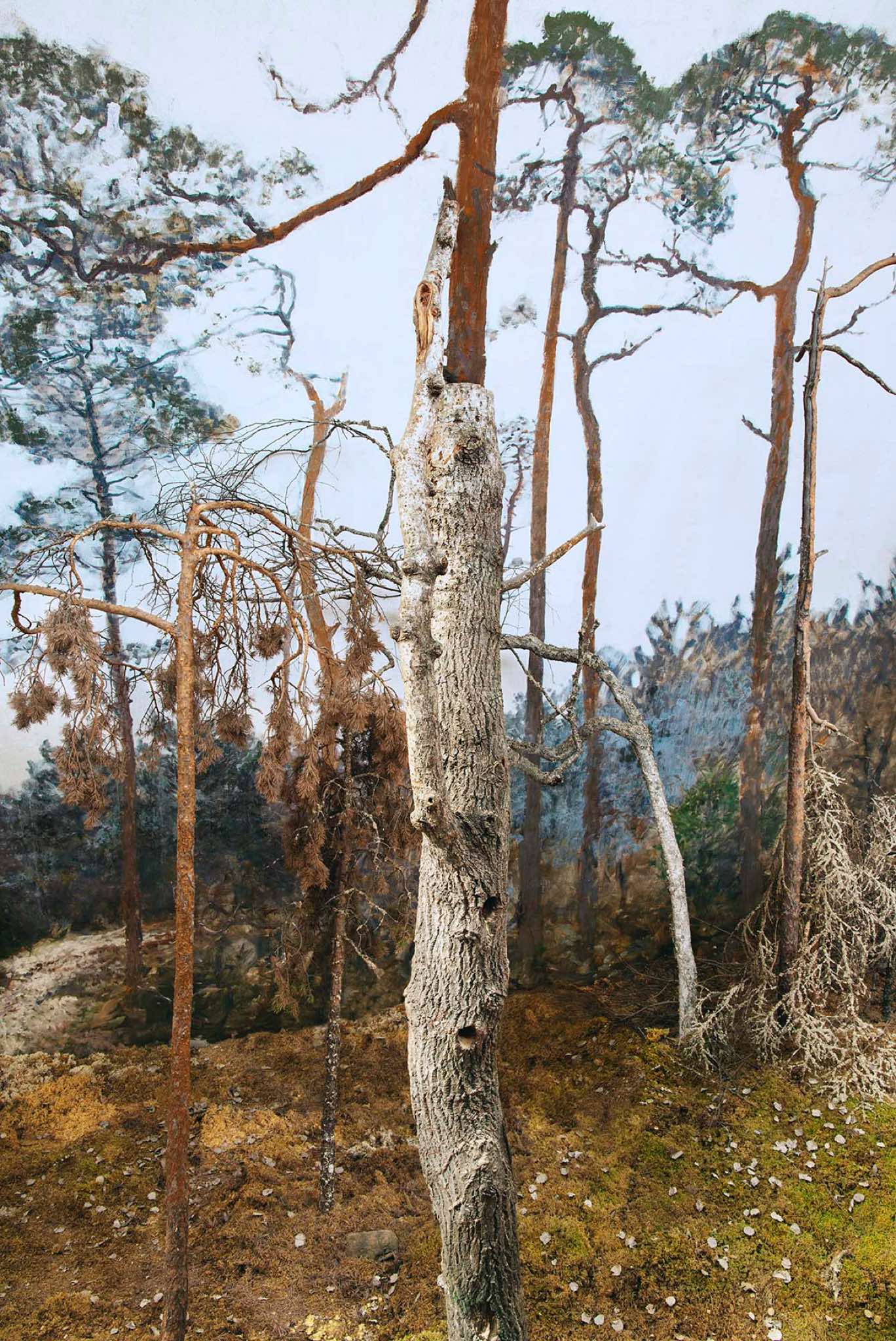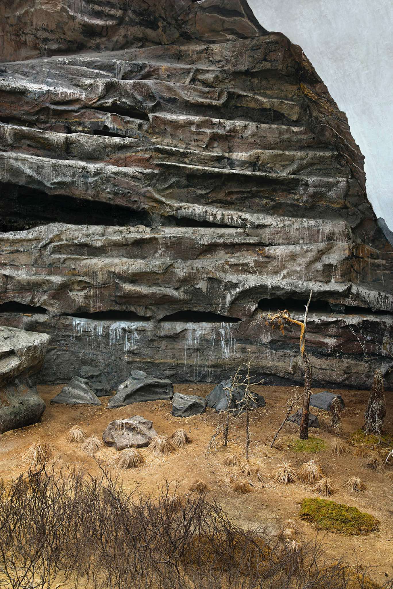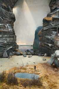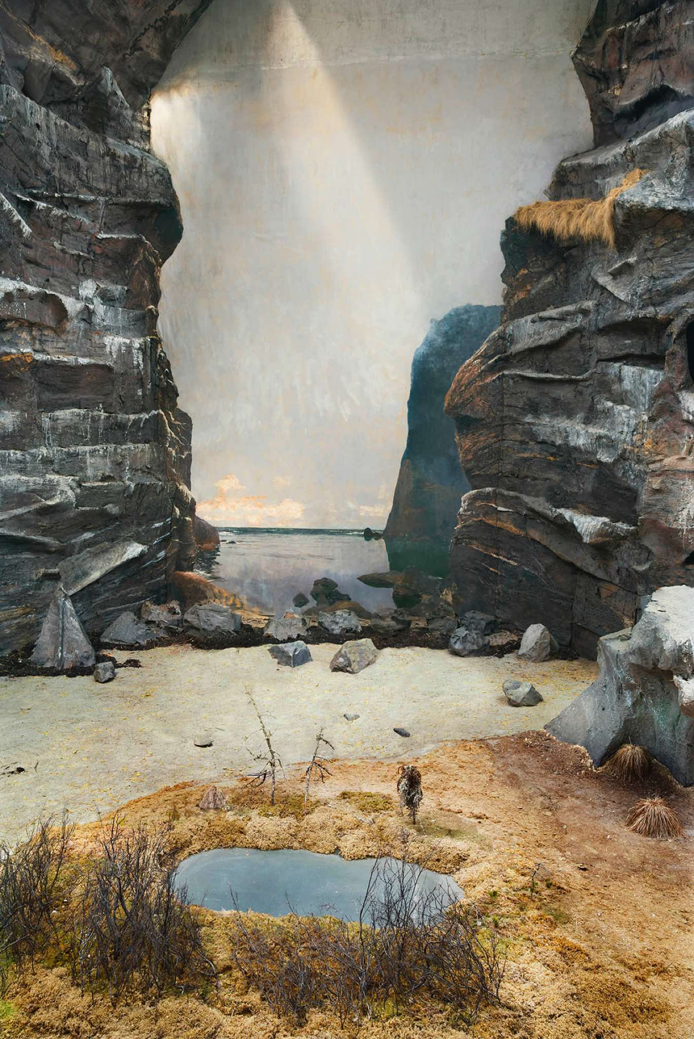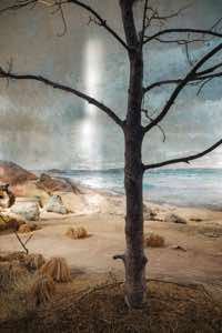 This is a land of isolation and mystery where the laws of nature have retreated –- the birds have flown away and the animals have disappeared. Waves still crash on the shore, but the sea is a painting and the beach is constructed of rocks with wire armatures. In the forests, dead trees are painted to appear alive and mountains are made of plaster. But sunlight streams over these unnatural surfaces, imbuing them with a veneer of vitality and the possibility of life.