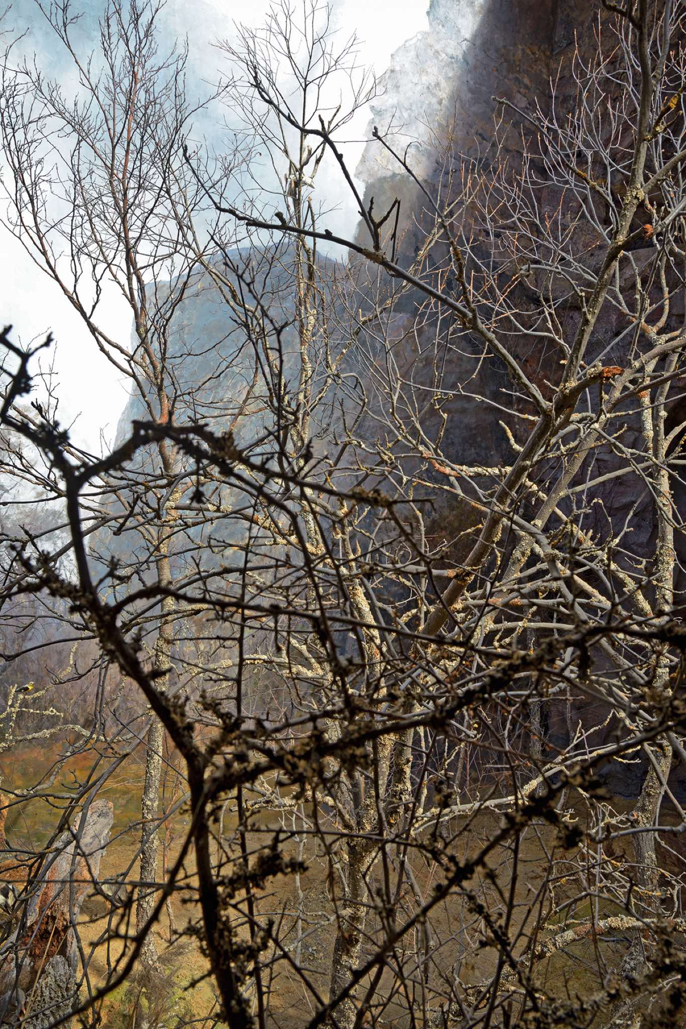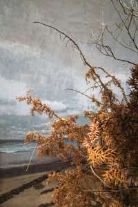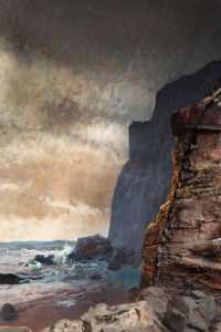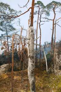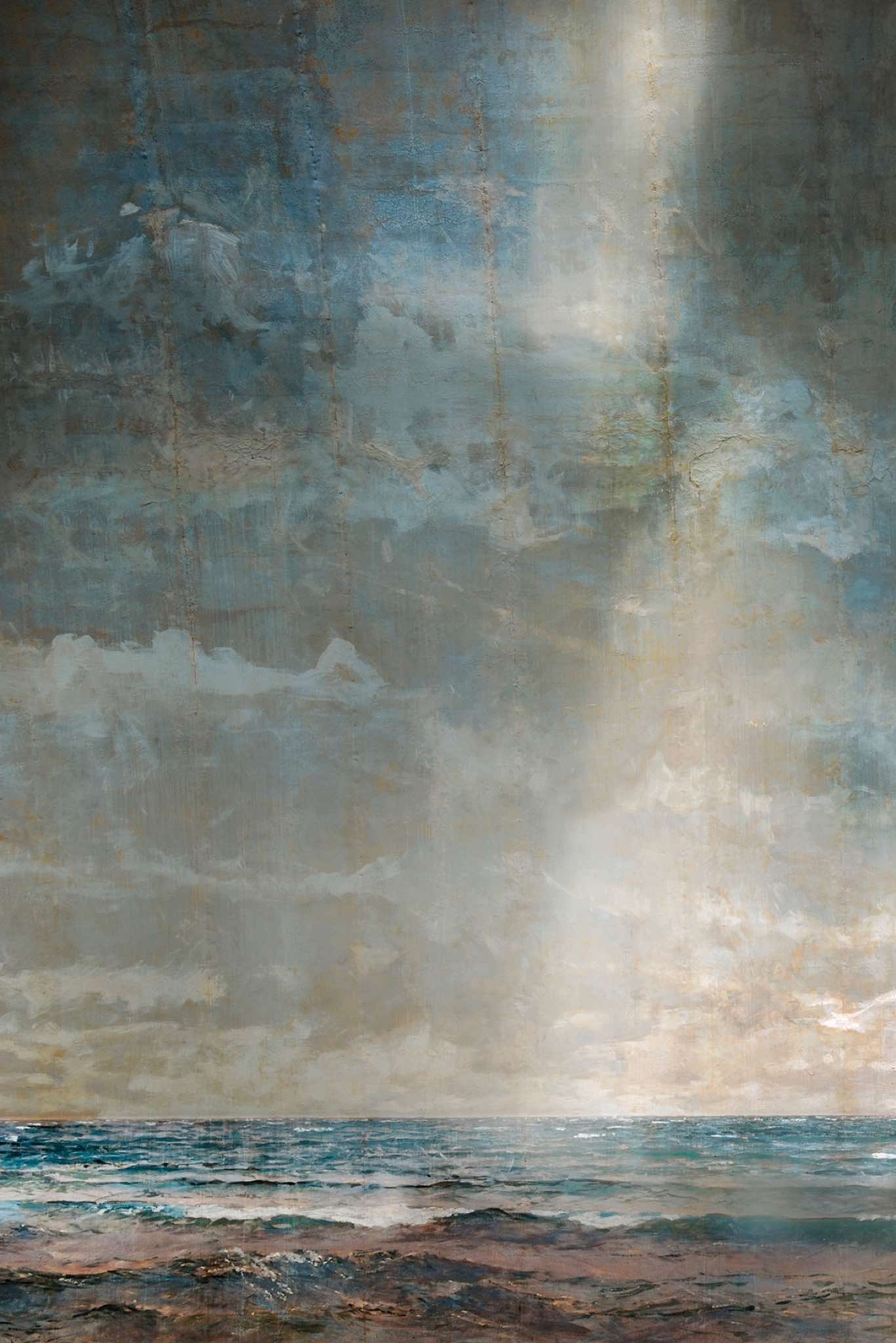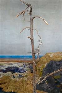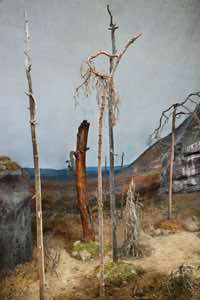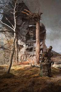 This is a land of isolation and mystery where the laws of nature have retreated –- the birds have flown away and the animals have disappeared. Waves still crash on the shore, but the sea is a painting and the beach is constructed of rocks with wire armatures. In the forests, dead trees are painted to appear alive and mountains are made of plaster. But sunlight streams over these unnatural surfaces, imbuing them with a veneer of vitality and the possibility of life.